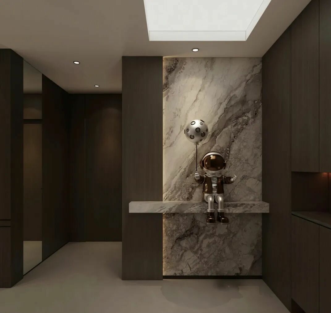 整体胡桃木色基调为主,大理石点缀,既清爽又自然,在晴空灯的加持下,氛围感十足,入户即展现韩系家居的内敛与质朴,视觉的延伸感,更给人沉稳又神秘的感觉。