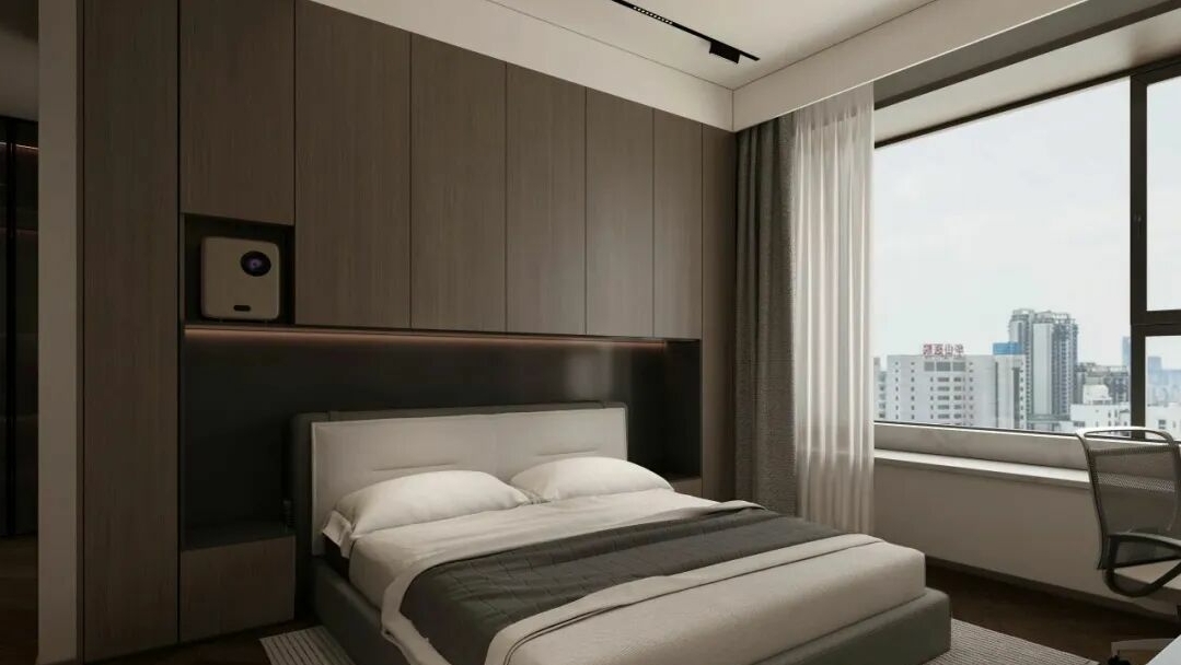 主卧套房以无主灯设计营造柔和氛围,胡桃木床头背景墙搭配深灰色床,沉稳优雅。内嵌投影仪提升现代感,米白色床品增添温馨,给人漫不经心的松弛和温暖感。